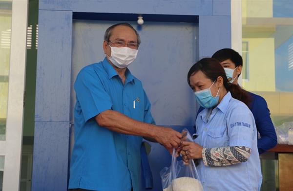 Đ/c Nguyễn Hòa - Chủ tịch LĐLĐ tỉnh trao gạo cho CNLĐ khó khăn trong đợt dịch Covid - 19