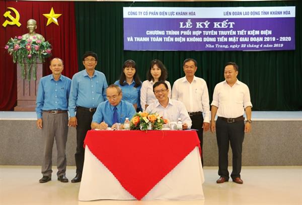 Chiều 22-4, Liên đoàn Lao động tỉnh và Công ty Cổ phần Điện lực Khánh Hòa tổ chức lễ ký kết chương trình phối hợp tuyên truyền tiết kiệm điện và thanh toán tiền điện không dùng tiền mặt giai đoạn 2019-2020.