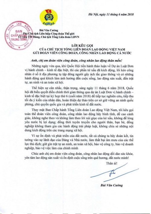 Sáng ngày 11.6.2018, Quốc hội đã biểu quyết điều chỉnh thời gian thông qua dự án Luật Đơn vị hành chính – kinh tế đặc biệt tại kỳ họp thứ 6 (cuối năm 2018) để tiếp tục nghiên cứu, tiếp thu tối đa ý kiến của nhân dân, hoàn thiện dự thảo trên cơ sở giữ vững an ninh quốc phòng, chủ quyền quốc gia và phát triển kinh tế đất nước. Ngay sau đó, đồng chí Bùi Văn Cường - Phó Chủ tịch Liên hiệp Công đoàn Thế giới, Ủy viên Trung ương Đảng, Chủ tịch Tổng LĐLĐVN đã gửi Lời kêu gọi đến anh chị em đoàn viên Công đoàn, công nhân lao động cả nước.