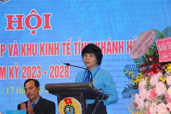Phát biểu chỉ đạo Đại hội, đồng chí Trần Thị Hương – Phó Chủ tịch LĐLĐ tỉnh ghi nhận những nỗ lực của đoàn viên, CNLĐ, CĐCS Khu CN, đồng thời đồng chí gợi mở một số nội dung tập trung: Tiếp tục thực hiện Nghị quyết số 20 - NQ/TW của Ban chấp hành TW khóa X về việc “Tiếp tục xây dựng giai cấp công nhân Việt Nam trong thời kỳ CNH, HĐH đất nước”, Nghị quyết số 02-NQ/TW ngày 12/6/2021 của Bộ Chính trị về đổi mới tổ chức và hoạt động Công đoàn Việt Nam trong tình hình mới, Nghị quyết số 09 của Bộ Chính trị về xây dựng, phát triển tỉnh Khánh Hòa đến 2030 và tầm nhìn đến năm 2045, Nghị quyết 55 của quốc hội về thí điểm một số cơ chế chính sách đặc thù phát triển tỉnh Khánh Hòa; Đổi mới hình thức, nội dung công tác tuyên truyền, giáo dục đoàn viên, Công nhân lao động phù hợp với xu thế phát triển của thời đại và điều kiện làm việc của người lao động; Tiếp tục thực hiện tốt công tác chăm lo lợi ích chính đáng của đoàn viên; lấy lợi ích đoàn viên là một trong những mục tiêu quan trọng; Thực hiện có hiệu quả Kế hoạch số 15-KH-TU ngày 26/02/2021 của Tỉnh ủy Khánh Hòa phát triển đảng, đoàn thể trong các đơn vị kinh tế tư nhân giai đọan 2021-2025; Phát động các phong trào thi đua yêu nước trong Công nhân viên chức lao động; Đào tạo, bồi dưỡng nâng cao năng lực, trình độ, bản lĩnh, kiến thức, kỹ năng cho cán bộ Công đoàn các cấp.
