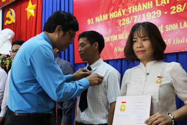 Đ/c Nguyễn Hòa - Chủ tịch LĐLĐ tỉnh tặng bằng khen cho chị Trần Thị Thơ - LĐLĐ TX Ninh Hòa