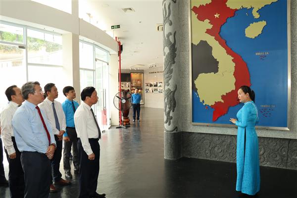 Các vị lãnh đạo Trung ương và tỉnh nghe thuyết minh, thăm quan khu trưng bày kỷ vật, khẳng định chủ quyền biển đảo tại Khu tưởng niệm chiến sĩ Gạc Ma.