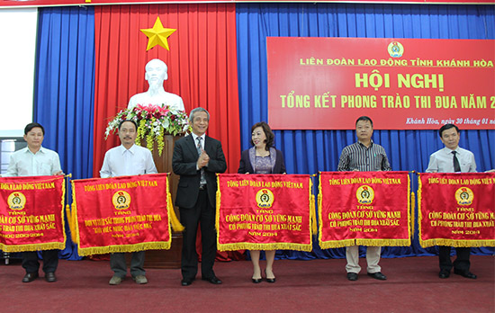 Chủ tịch Tổng LĐLĐVN Đặng Ngọc Tùng tặng cờ thi đua cho các tập thể xuất sắc năm 2014