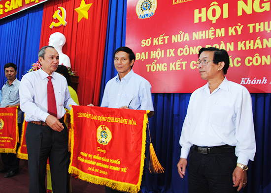 Chủ tịch LĐLĐ tỉnh Nguyễn Hoà Trao cờ thi đua của LĐLĐ tỉnh cho các đơn vị dẫn dầu