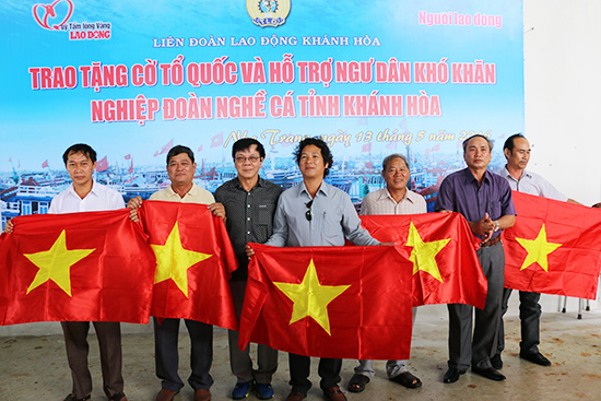Chiều 13-5, tại Cảng cá Hòn Rớ, TP Nha Trang, tỉnh Khánh Hòa, LDLĐ tỉnh phối hợp với Quỹ Tấm lòng vàng Người Lao Động, Lao Động tổ chức trao tặng 300 lá cờ Tổ quốc cho 6 nghiệp đoàn nghề cá, trong đó 4 nghiệp đoàn đã thành lập và 2 nghiệp đoàn chuẩn bị thành lập. Đồng thời, hỗ trợ 30 suất quà trị giá mỗi suất 500.000 đồng cho 30 ngư dân có hoàn cảnh khó khăn tỉnh Khánh Hòa.