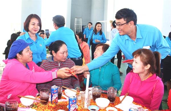 (trong ảnh: cán bộ công đoàn lì xì, chúc Tết công nhân năm 2020)