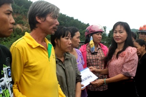Phó Chủ tịch LĐLĐ tỉnh Nguyễn Thị Hằng trao tiền hỗ trợ bà con bị thiệt hại trong vụ sạt lở