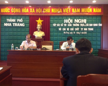 Sáng ngày 05/01/2013, Thường trực và các Ban HĐND tỉnh tiếp xúc cử tri với cán bộ chủ chốt của TP Nha Trang. Ông Mai Hữu Thu, Uỷ viên thường trực, ông Phan Thông, Trưởng ban Kinh tế và Ngân sách HĐND tỉnh chủ trì buổi tiếp xúc. Tham dự có đại diện Thường trực HĐND, UBND, Uỷ ban MTTQ Việt Nam, lãnh đạo các phòng ban và xã, phường của TP Nha Trang.