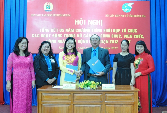 Sáng ngày 26/12/2017, tại TP Nha Trang, Liên đoàn Lao động (LĐLĐ) tỉnh và Hội Liên hiệp Phụ nữ (LHPN) tỉnh phối hợp tổ chức Hội nghị Tổng kết 05 năm thực hiện chương trình phối hợp giai đoạn 2012 – 2017 và ký kết chương trình phối hợp giai đoạn 2017 - 2022. Đ/c Nguyễn Hòa, Chủ tịch LĐLĐ tỉnh và đ/c Lê Minh Hiền, Chủ tịch Hội LHPN tỉnh đồng chủ trì hội nghị. Đ/c Nguyễn Bá Ninh, đại diện lãnh đạo Ban Dân vận Tỉnh ủy Khánh Hòa; các đ/c Phó Chủ tịch, lãnh đạo các ban LĐLĐ và Hội LHPN tỉnh, lãnh đạo LĐLĐ và Hội LHPN cấp huyện cùng tham dự hội nghị.