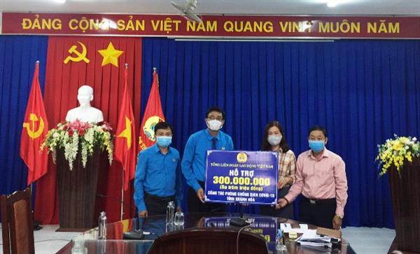 Tại đầu cầu Khánh Hòa, thừa ủy quyền Tổng LĐ, đồng chí Bùi Thanh Bình – Ủy viên Ban Chấp hành TLĐ, Chủ tịch LĐLĐ tỉnh trao 300 triệu đồng cho lãnh đạo Ủy ban Mặt trận Tổ quốc Việt Nam tỉnh nhằm hỗ trợ công tác phòng chống dịch bệnh Covid-19.