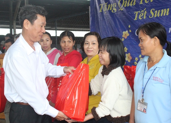 Đồng chí Nguyễn Tấn Tuân trao quà tết cho công nhân ở Khu công nghiệp Suối Dầu.