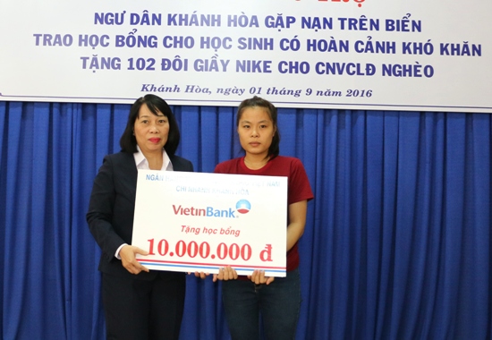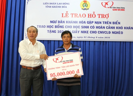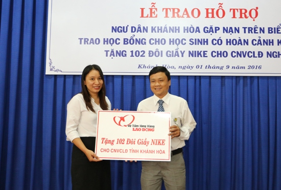 Ngày 31-8, Liên đoàn Lao động tỉnh phối hợp với Quỹ Tấm lòng vàng Lao động và Ngân hàng TMCP Công thương Việt Nam chi nhánh Khánh Hòa đã tổ chức trao tiền hỗ trợ cho ngư dân gặp nạn trên biển, học bổng cho học sinh nghèo và tặng giầy Nike cho CNLĐ khó khăn.