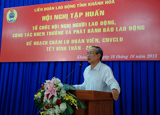 Ngày 16-10, LĐLĐ tỉnh đã tổ chức nghị tập huấn triển khai Hướng dẫn số 1499/HD-TLĐ ngày 21/9/2015 của Tổng LĐLĐVN về việc Công đoàn tham gia tổ chức hội nghị người lao động và xây dựng quy chế đối thoại tại doanh nghiệp; công tác khen thưởng trong hệ thống Công đoàn; triển khai Công văn số 1489/TLĐ ngày 18/9/2015 của Tổng LĐ về việc thực hiện Chỉ thị 01/CT-TLĐ ngày 06/01/2014 của Đoàn Chủ tịch Tổng LĐLĐVN “Nâng cao chất lượng, hiệu quả hoạt động báo chí, xuất bản của tổ chức Công đoàn trong tình mới” và Kế hoạch tổ chức các hoạt động chăm lo đời sống CNVCLĐ trong dịp Tết Nguyên đán Bính Thân 2016 đến các cấp CĐ trong tỉnh và một số doanh nghiệp Trung ương đóng trên địa bàn tỉnh. Đồng chí Nguyễn Hòa – UVBCH Tổng LĐLĐVN, Tỉnh ủy viên, Chủ tịch LĐLĐ tỉnh chủ trì hội nghị.