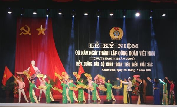 Trong không khí cả nước sôi nổi thi đua chào mừng 90 năm Ngàu thành lập Công đoàn Việt Nam, sáng 26/7, Liên đoàn Lao động tỉnh Khánh Hòa tổ chức Lễ kỷ niệm 90 năm Ngày thành lập Công đoàn (CĐ) Việt Nam (28/7//1929-28/7/2019) và biểu dương cán bộ CĐ tiêu biểu xuất sắc. Đến dự có các ông: Nguyễn Tấn Tuân - Phó Bí thư Thường trực Tỉnh ủy, Chủ tịch HĐND tỉnh; Lê Đức Vinh - Phó Bí thư Tỉnh ủy, Chủ tịch UBND tỉnh; Trần Ngọc Thanh - Ủy viên Ban Thường vụ Tỉnh ủy, Chủ tịch Ủy ban Mặt trận Tổ quốc Việt Nam tỉnh; Trần Mạnh Dũng - Ủy viên Ban Thường vụ Tỉnh ủy, Trưởng Ban Dân vận Tỉnh ủy; Hồ Văn Mừng - Ủy viên Ban Thường vụ Tỉnh ủy, Trưởng Ban Tuyên giáo Tỉnh ủy.