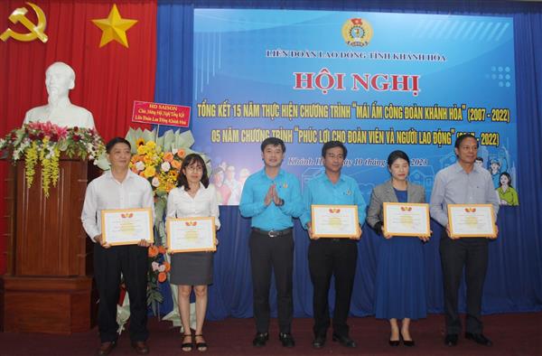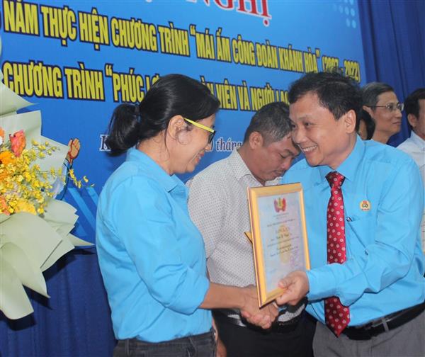 Nhân dịp này, Liên đoàn Lao động tỉnh tặng bằng khen cho 18 tập thể, 9 cá nhân có nhiều thành tích trong thực hiện Chương trình “Mái ấm Công đoàn Khánh Hòa” giai đoạn 2007 - 2022; tặng bằng khen cho 5 tập thể có nhiều thành tích trong thực hiện Chương trình “Phúc lợi cho đoàn viên và người lao động” giai đoạn 2017 - 2022.