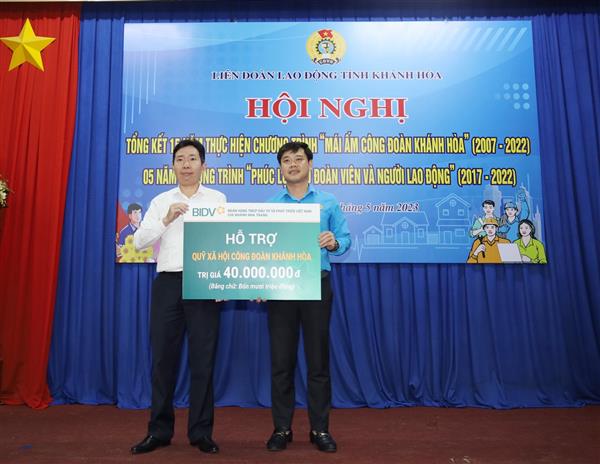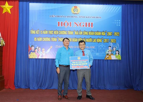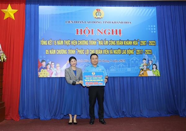 Qua 15 năm thực hiện Chương trình “Mái ấm công đoàn Khánh Hòa”, các cấp công đoàn, đoàn viên, người lao động, doanh nghiệp đã đóng góp được hơn 18,4 tỷ đồng cho Quỹ “Xã hội Công đoàn Khánh Hòa”. Qua đó, Liên đoàn Lao động tỉnh đã khảo sát, bình xét, hỗ trợ xây mới 443 nhà và sửa chữa 66 nhà cho đoàn viên, người lao động nghèo với tổng số tiền hỗ trợ hơn 15,8 tỷ đồng. Ngoài ra, các cấp công đoàn còn phối hợp hỗ trợ hơn 600 triệu đồng xây dựng nhà ở cho gia đình cán bộ, chiến sĩ công tác tại huyện đảo Trường Sa và ngư dân có hoàn cảnh khó khăn về nhà ở. Về Chương trình “Phúc lợi cho đoàn viên và người lao động”, 5 năm qua, các cấp công đoàn đã vận động, ký kết 46 bản thỏa thuận hợp tác với các đơn vị, doanh nghiệp mang lại phúc lợi cho hơn 50.000 lượt đoàn viên, người lao động, giá trị từ các chương trình phúc lợi mang lại hơn 5 tỷ đồng…