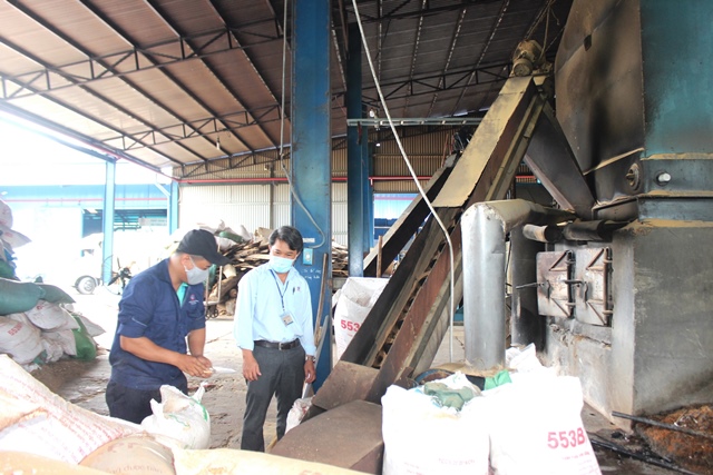 công nhân vận hành hệ thống cấp chất đốt tự động cho lò hơi đốt củi