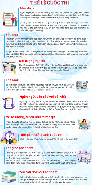 Cuộc thi viết "Vòng tay Công đoàn" do Tạp chí Lao động và Công đoàn tổ chức với mục đích tuyên truyền, cổ vũ những trường hợp đoàn viên, người lao động được tổ chức Công đoàn, cán bộ công đoàn, doanh nghiệp chăm lo thiết thực, nhờ đó, đoàn viên, người lao động đã có sự thay đổi tích cực cuộc sống của mình. Qua đó, nêu bật nỗ lực, cố gắng của tổ chức Công đoàn các cấp, đội ngũ cán bộ công đoàn trong thực hiện nhiệm vụ; khẳng định Công đoàn Việt Nam đã, đang và sẽ mãi mãi là chỗ dựa vững chắc, tin cậy, nơi xứng đáng gửi gắm niềm tin của đoàn viên, người lao động.