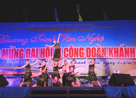 Tối ngày 30-3, tại quảng trường 2-4 TP Nha Trang Công đoàn Viên chức tỉnh và CĐ Văn hóa - Thể thao và Du lịch Khánh Hòa đã tổ chức chương trình văn nghệ chào mừng Đại hội IX Công đoàn Khánh Hòa. Gần 20 tiết mục hát, múa về biển đảo, về Trường Sa, về quê hương đất nước, ca ngợi Đảng, Bác Hồ kính yêu, hát về giai cấp công nhân và tổ chức công đoàn Việt Nam…Đêm văn nghệ nằm trong chuỗi hoạt động chào mừng Đại hội IX Công đoàn Khánh Hòa và hưởng ứng phong trào xây dựng đời sống văn hóa cơ sở.