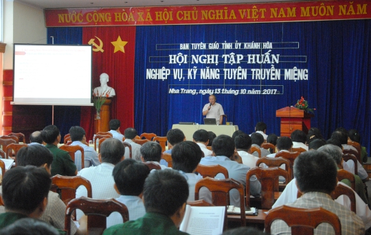 Ngày 13/10, tại Trung tâm Hội nghị 46 Trần Phú, Ban Tuyên giáo Tỉnh ủy Khánh Hòa tổ chức Hội nghị tập huấn nghiệp vụ, kỹ năng tuyên truyền miệng cho 300 báo cáo viên Tỉnh ủy, báo cáo viên cấp huyện, thị, thành phố. Về dự có đồng chí Hồ Văn Mừng - Trưởng ban Tuyên giáo Tỉnh ủy; Phó giáo sư-Tiến sĩ Lương Khắc Hiếu nguyên Giám đốc Học viện Báo chí và Tuyên truyền.