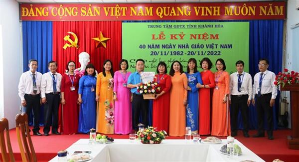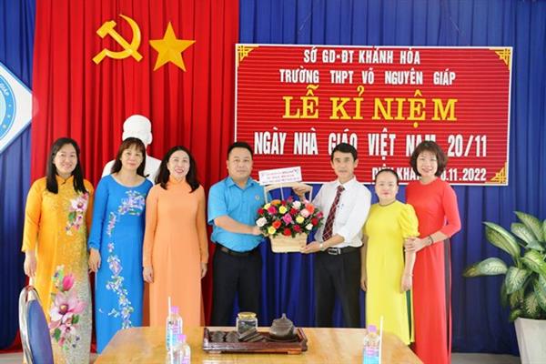 Tiếp đó, Đoàn công tác Liên đoàn Lao động tỉnh đã đến thăm, chúc mừng các trường THPT Võ Nguyên Giáp (huyện Diên Khánh), THPT Đoàn Thị Điểm (huyện Cam Lâm), THPT Hoàng Văn Thụ (thành phố Nha Trang) và Trung tâm Giáo dục thường xuyên tỉnh Khánh Hoà. Tại những nơi đến thăm và tặng quà, đoàn đã biểu dương kết quả đạt được của đơn vị, CĐCS nhà trường và gửi những lời chúc tốt đẹp nhất, đến toàn thể cán bộ, giáo viên, nhân viên, nhân kỷ niệm 40 năm Ngày Nhà giáo Việt Nam. Cũng nhân dịp này, Công đoàn ngành giáo dục Khánh Hoà đã tặng quà các 06 đoàn viên, nhà giáo có hoàn cảnh khó khăn, bệnh hiểm nghèo…để tiếp tục công tác và hoàn thành tốt nhiệm vụ.