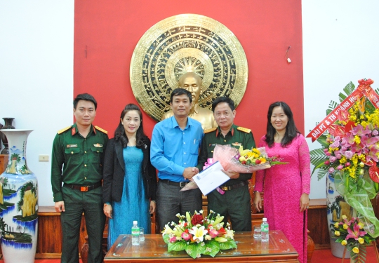 Đ/c Bùi Thanh Bình - Phó Chủ tịch LĐLĐ tỉnh tặng hoa chúc mừng Bộ Chỉ huy Quân sự tỉnh