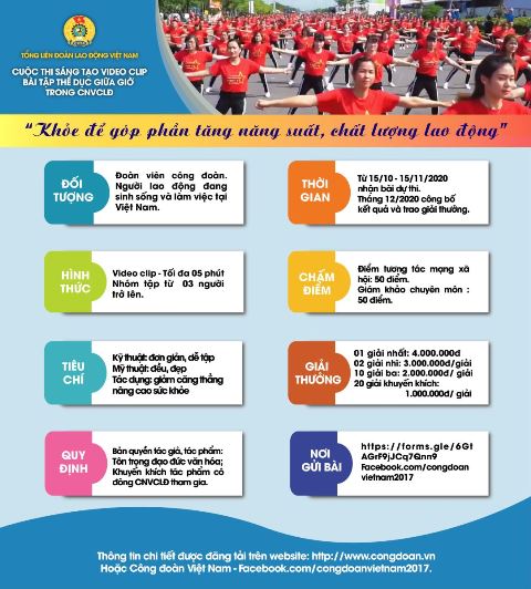 Tác phẩm dự thi là những Video clip tập thể dục của nhóm ít nhất từ 03 người trở lên, được quay bằng máy quay, máy ảnh hay điện thoại thông minh, có chất lượng, độ nét cao, có tính nghệ thuật, nội dung phù hợp với tiêu chí của cuộc thi. Thời lượng tối đa 05 phút / Video clip dự thi. Địa điểm thực hiện Video clip bài tập thể dục là nơi làm việc, nhà ăn, văn phòng, sân bãi, nơi ở, khu nhà trọ… của công nhân, viên chức, lao động. Nơi đăng tải bình chọn bài thi địa chỉ trang Facebook Công đoàn Việt Nam – Facebook.com/congdoanvietnam2017.