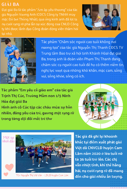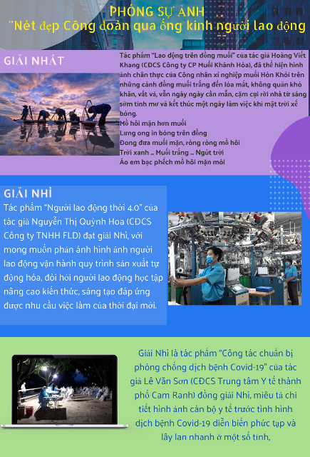 Sau 3 tháng phát động Cuộc thi "Nét đẹp Công đoàn và người lao động Khánh Hòa năm 2020" trên mạng xã hội, hơn 1.600 tác phẩm đến của đoàn viên, CĐCS tham gia Cuộc thi. Ban Tổ chức Cuộc thi đã lựa chọn 119 tác phẩm xuất sắc vào vòng chung kết. Các tác phẩm đã khắc họa những hình ảnh vừa chân thực, vừa sinh động qua những câu chuyện đẹp về người cán bộ công đoàn, sự cần mẫn của người lao động trong lao động sản xuất. Ban Tổ chức Cuộc thi đã trao giải Nhất cho Tác phẩm “Lao động trên đồng muối” Hoàng Viết Khang - Chủ tịch CĐCS Công ty CP Muối Khánh Hòa, 2 giải Nhì, 4 giải Ba và 17 giải khác.