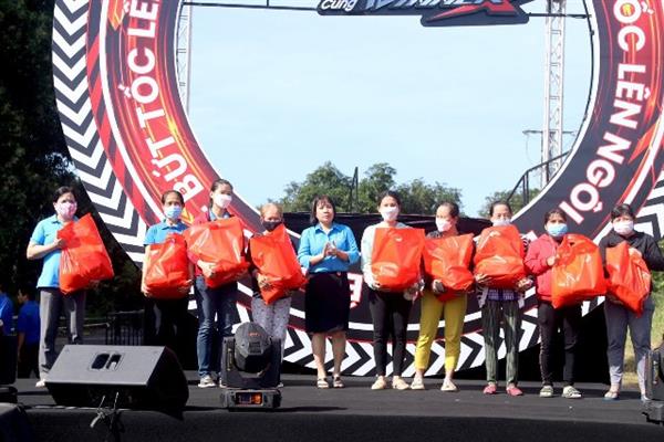 Đ/c Trương Thị Thu - Chủ tịch CĐ các KCN trao quà hỗ trợ CNLĐ có hoàn cảnh khó khăn