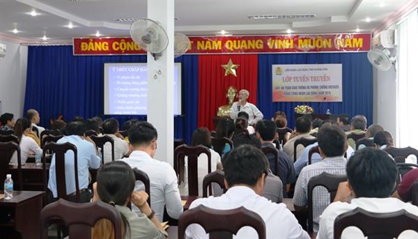 Thực hiện Chương trình mục tiêu quốc gia, ngày 13/9/2019, Liên đoàn Lao động tỉnh tổ chức lớp tuyên truyền Luật an toàn giao thông và phòng chống HIV/AIDS cho 100 công nhân lao động các doanh nghiệp trực thuộc Công đoàn ngành Công thương và Xây dựng tỉnh Khánh Hòa. Về dự và báo cáo viên lớp tập huấn có đồng chí Nguyễn Viết Hùng – Ban An toàn giao thông tỉnh và bác sĩ Tôn Thất Toàn – Phó Giám đốc Trung tâm Kiểm soát bệnh tật tỉnh Khánh Hòa.