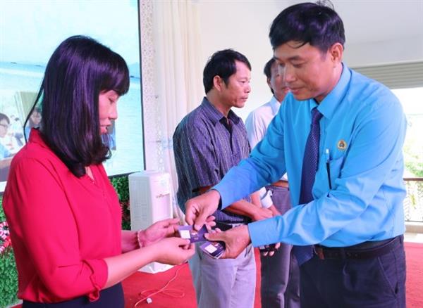 Đ/c Bùi Thanh Bình - Phó Chủ tịch LĐLĐ tỉnh trao thẻ ưu đãi cho đoàn viên, NLĐ
