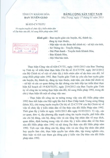 - CÔNG VĂN 621/TLĐ VỀ VIỆC SỬA ĐỔI, BỔ SUNG Đ 9, 10 HIẾN PHÁP (10/05/2013)