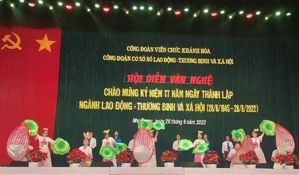Hội diễn lần này thu hút hơn 300 diễn viên không chuyên đến từ 17 CĐSC thành viên thuộc CĐSC sở LĐ- TBXH tỉnh Khánh Hòa với 34 tiết mục văn nghệ đặc sắc với chủ đề ca ngợi quê hương, đất nước, ca ngợi Bác Hồ, ca ngợi ngành LĐ-TBXH.