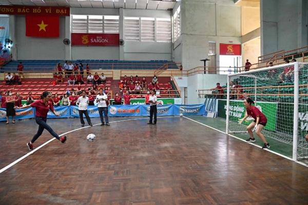Các vận động viên thi đấu sôi nổi môn sút cầu môn nữ (ảnh Ngọc Minh)