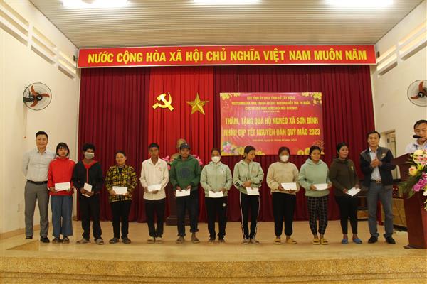 Tại đây, Đoàn công tác đã trao tặng 4 hộ nghèo không có đất sản xuất, mỗi hộ 1 con bò với tổng trị giá 68 triệu đồng; trao tặng 05 hộ nghèo có đất sản xuất, mỗi hộ 30 cây giống sầu riêng với tổng trị giá 18 triệu đồng. Lãnh đạo các đơn vị còn trao quà Tết cho UBND xã Sơn Bình và tặng 50 phần quà Tết, mỗi phần 500.000 đồng tiền mặt cho các hộ gia đình chính sách, hộ nghèo trên địa bàn xã.