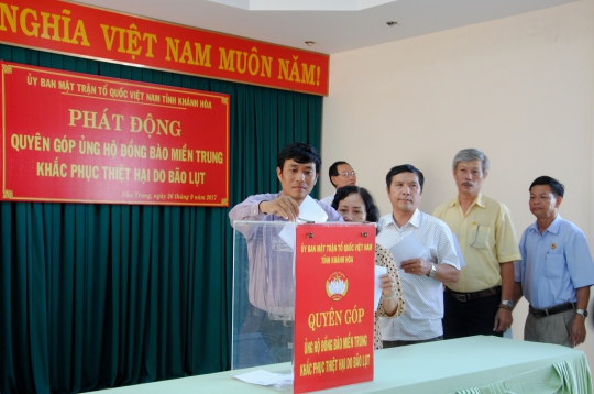 Chiều 26/9, Ủy ban MTTQ Việt Nam - Ban Cứu trợ tỉnh Khánh Hòa đã tổ chức Lễ phát động ủng hộ đồng bào miền Trung khắc phục thiệt hại do mưa lũ, đồng chí Trần Ngọc Thanh – Chủ tịch UB MTTQ VN tỉnh đã kêu gọi các cơ quan, đơn vị, các tổ chức, các doanh nghiệp, các nhà hảo tâm và nhân dân trong tỉnh phát huy đoàn kết, tương thân tương ái “Lá lành đùm lá rách”, thể hiện bằng những hành động hỗ trợ thiết thực về tinh thần và vật chất hướng về đồng bào các tỉnh miền Trung bị bão lũ, góp phần khắc phục hậu quả, vượt qua khó khăn sớm vươn lên ổn định cuộc sống.