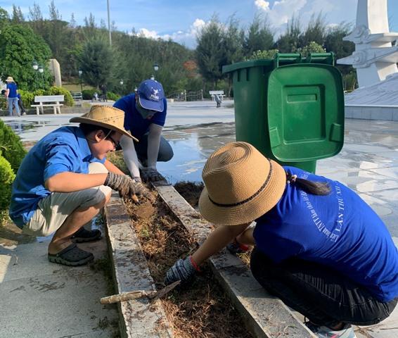 Đoàn viên thanh niên dọn vệ sinh các bồn hoa tại Khu tưởng niệm