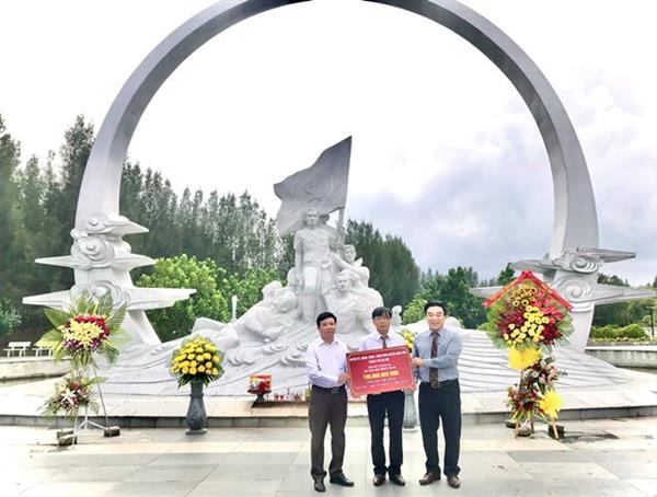Đại diện đoàn công tác huyện Hoài Đức trao kinh phí hỗ trợ tu bổ Khu tưởng niệm chiến sĩ Gạc Ma